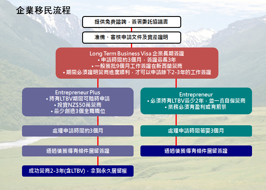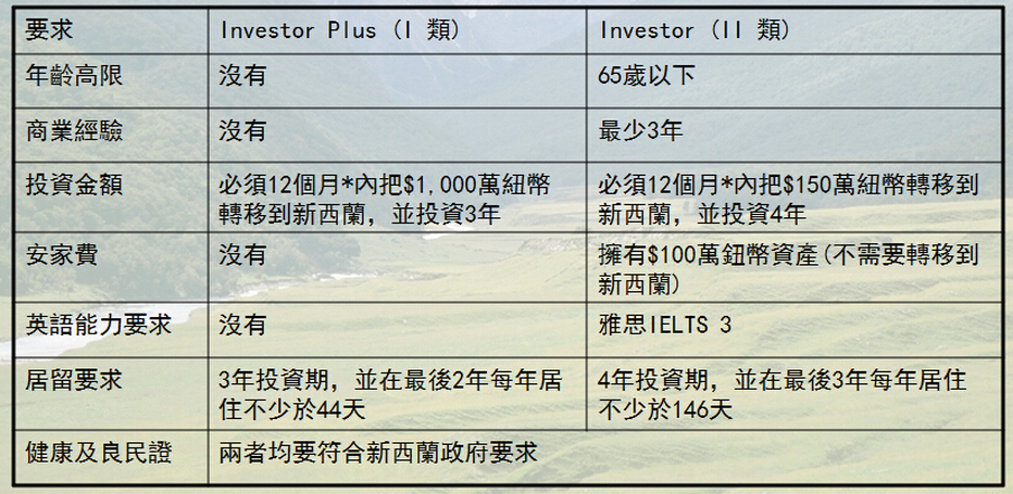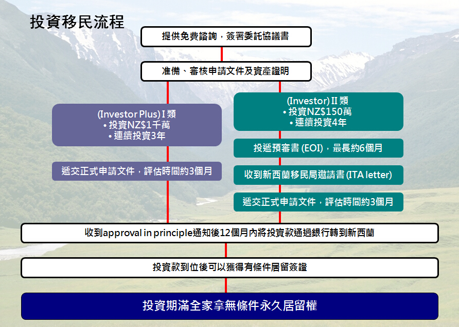 New Zealand 新西蘭 新西蘭移民好處一人申請成功﹐全家可以馬上移民,子女最高年齡限制是24歲*以下。新西蘭企業及投資移民政策採用客觀指標計分制,因此避免受到人為或主觀因素影響;申請人遞交相關材料後審理流程短,一般只需約3個月左右。承認雙重國籍,可以在中國繼續你的生意和事業。取得永久居民身份後﹐17歲以下子女享受完全免費義務教育, 亦可合法工作。全家享受醫療保障、社會福利、保障家人高品質的生活 (基本上,除了沒有選舉權及護照外,永久居民與公民享有幾乎同等之社會福利)。老年養老金制度歷史悠久,為年老居民提供周全保障。申請公民及護照資格:取得永久居民身份後﹐必須五年內在紐西蘭住滿1350日及這5年內每年最少住滿240天。您可以合法居留澳洲 — 根據新西蘭及澳洲兩國協定,新西蘭公民可以自由進出澳洲,在澳洲無限期定居、工作、及接受教育。 投資移民類別兩種投資移民類別:Investor Plus (I 類) 及 Investor (II 類),兩者投資期滿均可全家獲得居留權 移民流程圖