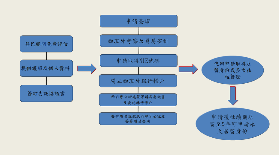 Spain 西班牙 西班牙居留政策最寬鬆條件取得居留身份之國家對申請人無學歷、語言及商業背景要求;另獲多次簽證 (Multi – entrance Visa),可自由進出西班牙及其它申根成員國家;少有的購房移民計畫國家, 深受國內人士喜愛 申請條件非常簡單西班牙無違犯出入境無犯罪紀錄非西班牙禁止入境名單身體健康狀況良好客戶只需親身前往西班牙 一次 就可辦理購房、申請多次簽證及申請居留身份。 申請流程